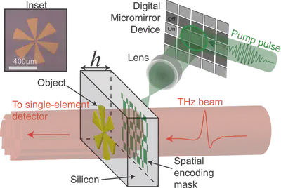 We demonstrate a form of near-field terahertz (THz) imaging that is compatible with compressed sensing algorithms. By spatially photomodulating THz pulses using a set of shaped binary optical patterns and employing a 6-μm-thick silicon wafer, we are able to reconstruct THz images of an object placed on the exit interface of the wafer. A single-element detector is used to measure the electric field amplitude of transmitted THz radiation for each projected pattern, with the ultra-thin wafer allowing us to access the THz evanescent near fields to achieve a spatial resolution of ∼9μm (λ/45 at 0.75 THz). We conclude by experimentally improving the image rate by a factor of ∼3 by undersampling the object with adaptive and compressed sensing algorithms.. Full publication at Optica Vol. 4, Issue 8, pp. 989-992 (2017).
